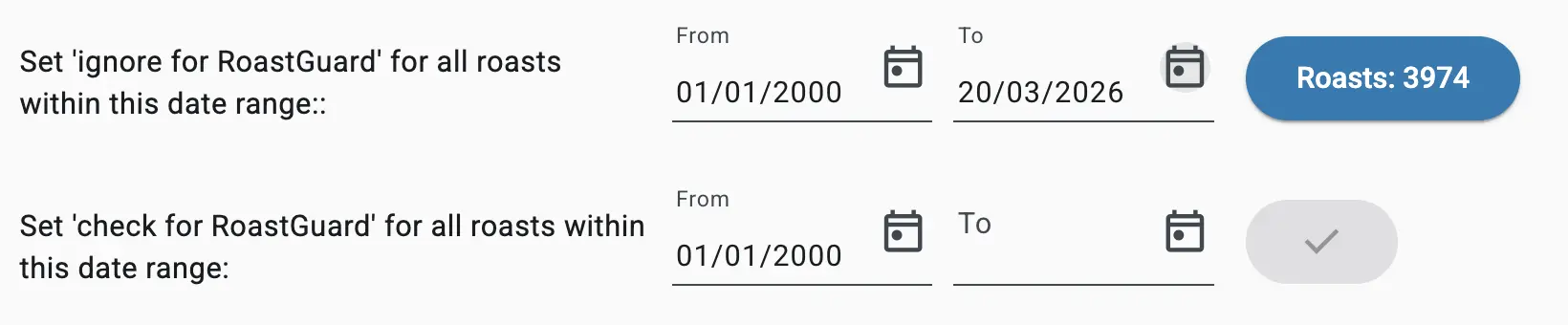 The RoastGuard settings page provides controls in the lower section that allow you to exclude or include all roasts within a specific time period for evaluation.