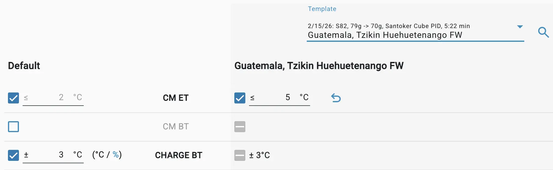 Watch out! The specific RoastGuard parameter limits assigned to template roasts override the corresponding active default limits, which are valid for all roasts.