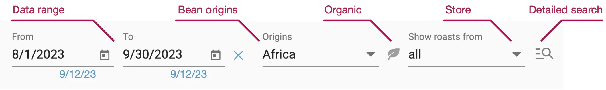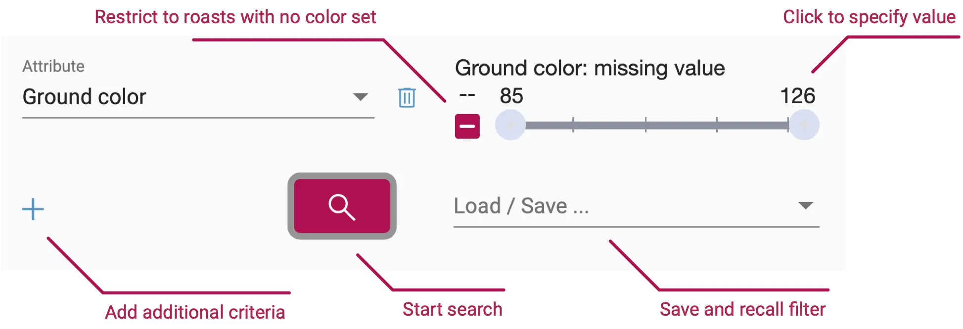 Watch out! Some of the additional search parameters are only available in accounts making use of the corresponding advanced features. For example, you can only restrict your search by the user that roasted if your account is used by multiple users.