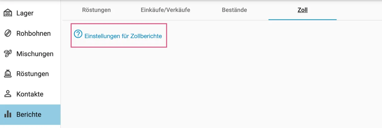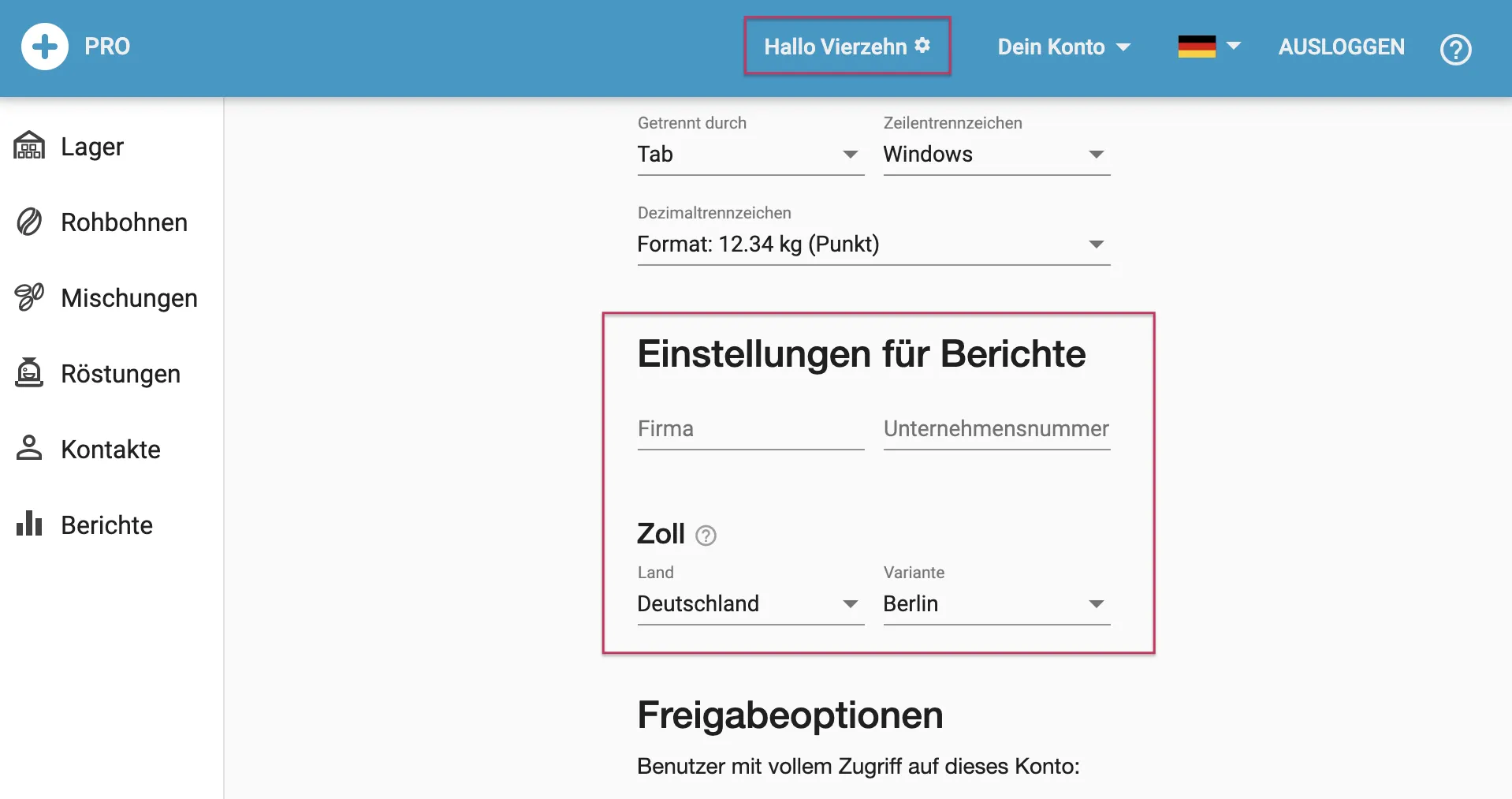 Röstprotokolle lassen sich im Reiter “Berichte” unter dem Eintrag “Röstungen” anlegen. Zunächst ist es jedoch sinnvoll in den Kontoeinstellungen den vollständigen Firmennamen sowie die Unternehmensnummer in den entsprechenden Feldern zu hinterlegen, damit die generierten Berichte vom Zoll zugeordnet werden können.