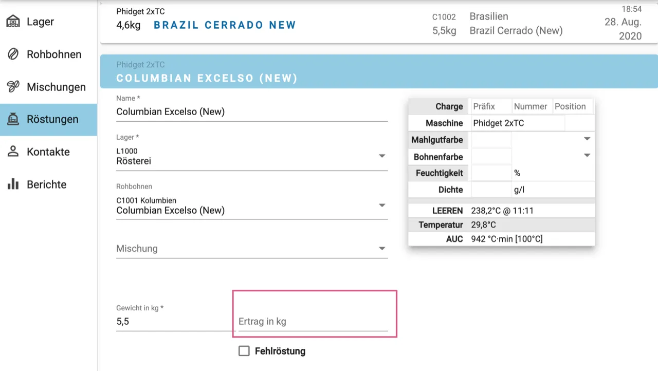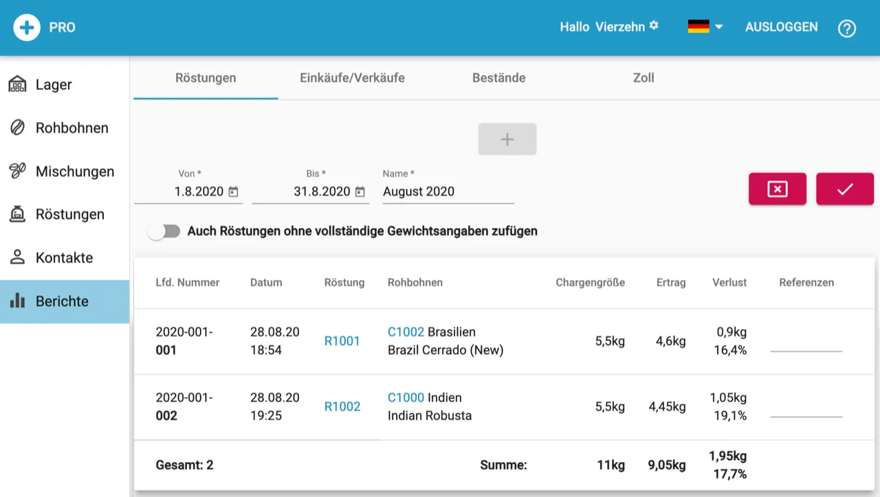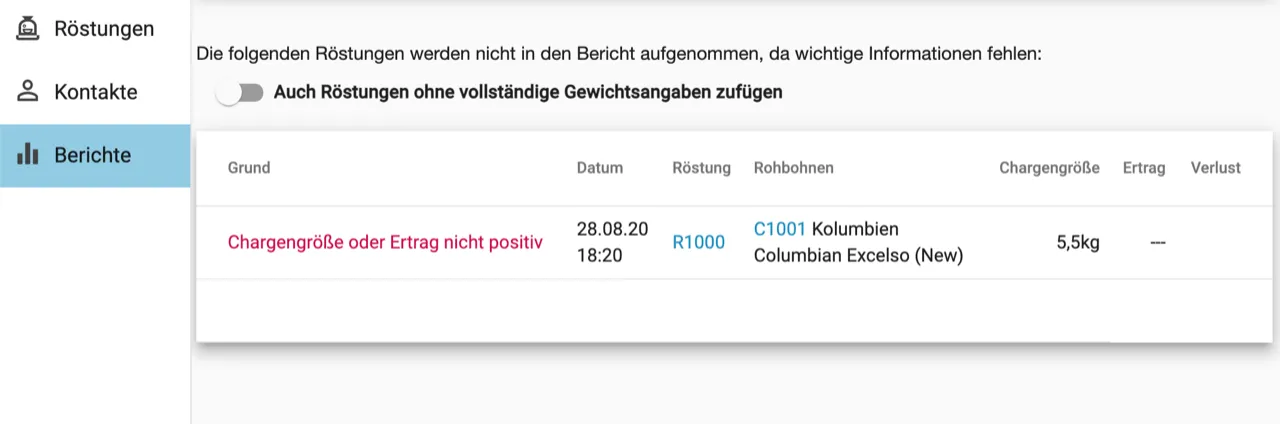BEACHTE Die Megen an Röstkaffee von Fehlröstungen werden in diesen Berichten NICHT zum Ertrag hinzu gezählen.