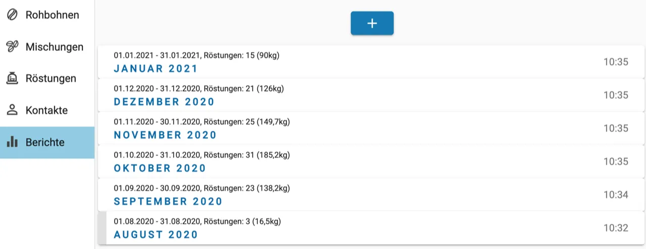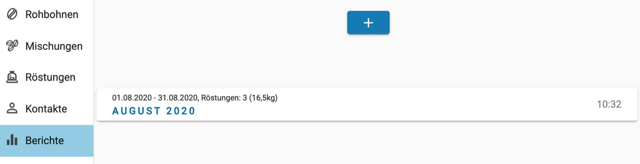 Mit der “+” Taste lässt sich ein neuer Röstbericht anlegen. Nun ist noch der abzudeckende Zeitraum mittels der entsprechenden Eingabeelemente anzugeben. Die Anforderung der lückenlosen Dokumentation legt fest, dass der Startzeitpunkt eines neuen Bericht sich immer aus dem Endzeitpunkt des vorherigen Berichts automatisch ergibt, mit Ausnahme des allerersten Berichtes. Für diesen ersten Bericht wird das Datum der ersten Röstung als Startzeitpunkt vorgeschlagen. Als Endzeitpunkt wird das nächste Monatsende vorgeschlagen, dieser Zeitpunkt lässt sich aber immer anpassen. So sind auch Berichte über andere Zeiträume möglich.