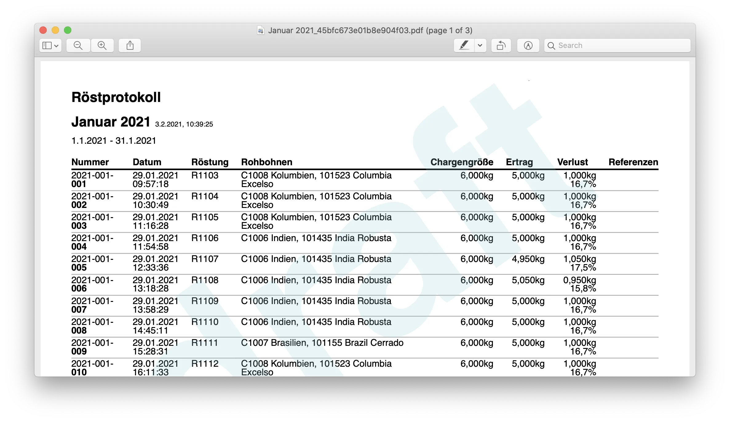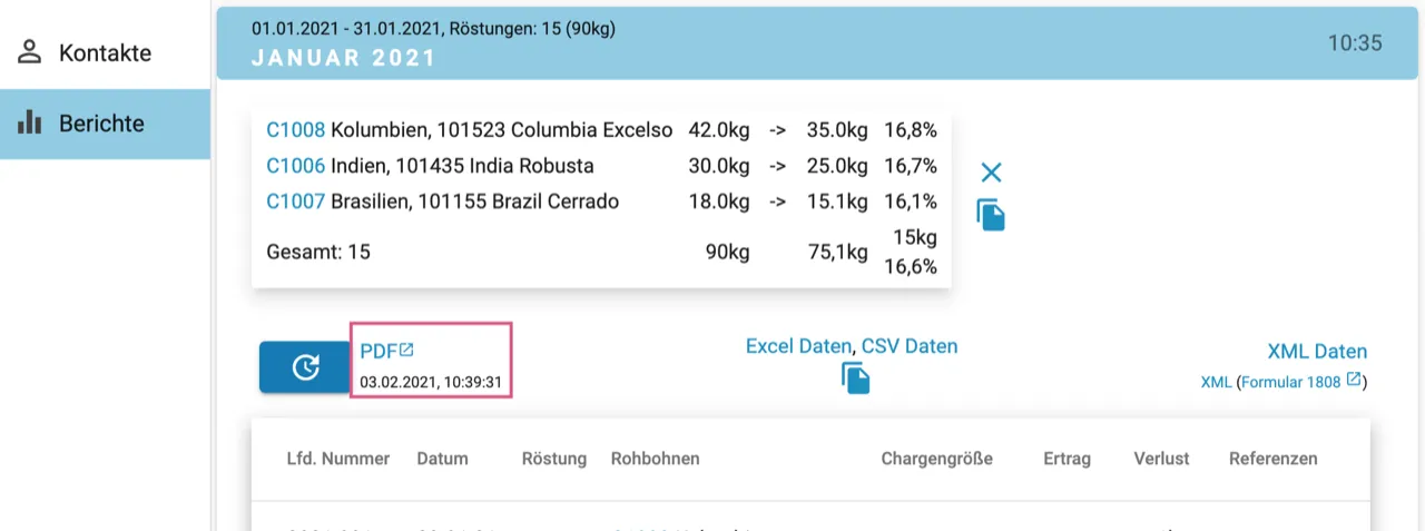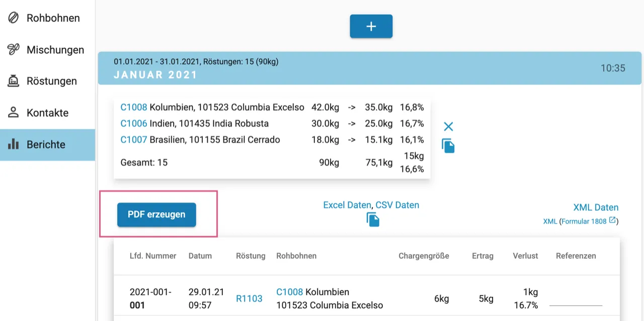 Öffnet man nun solch einen Bericht, sieht am oben eine Zusammenfassung der enthaltenen Röstungen als auch einen Taster der die Generierung des Berichts als PDF ermöglicht.