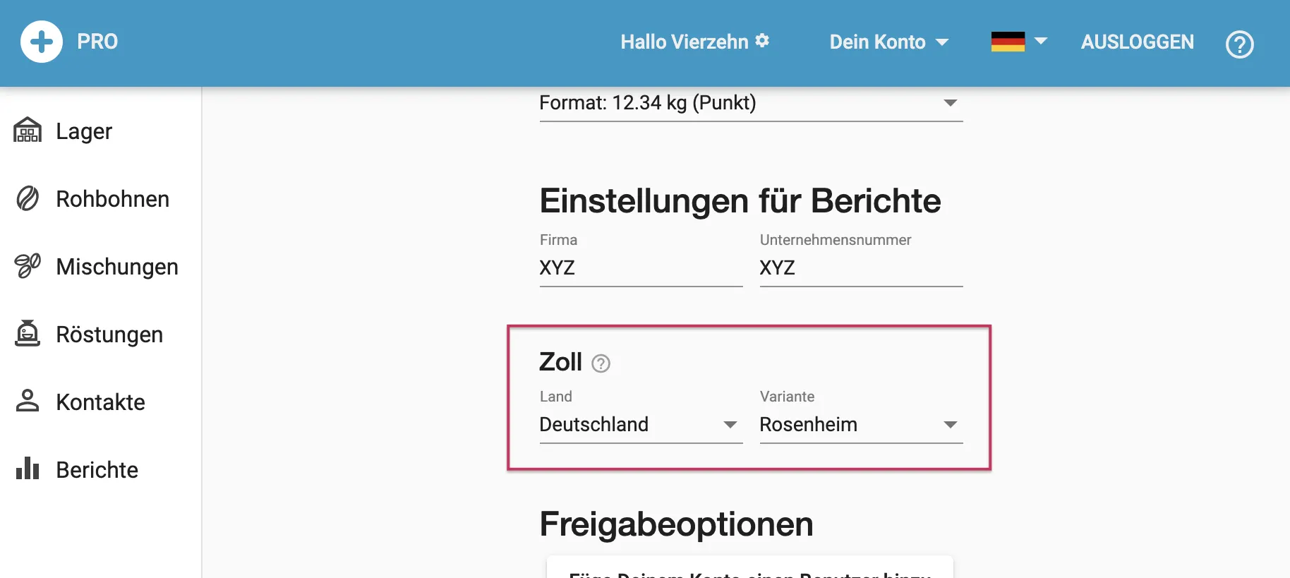 Zunächst muss die Variante der Röstberichte in den Kontoeinstellungen gesetzt werden. Bisher unterstützen wir das Format vom Zollamt Rosenheim und jenes von Berlin. Eventuell hat Dein Zollamt ein eigenes Excel Formular. Wenn Du uns jenes Formular zukommen lässt können wir auch Unterstützung für dieses einbauen.
