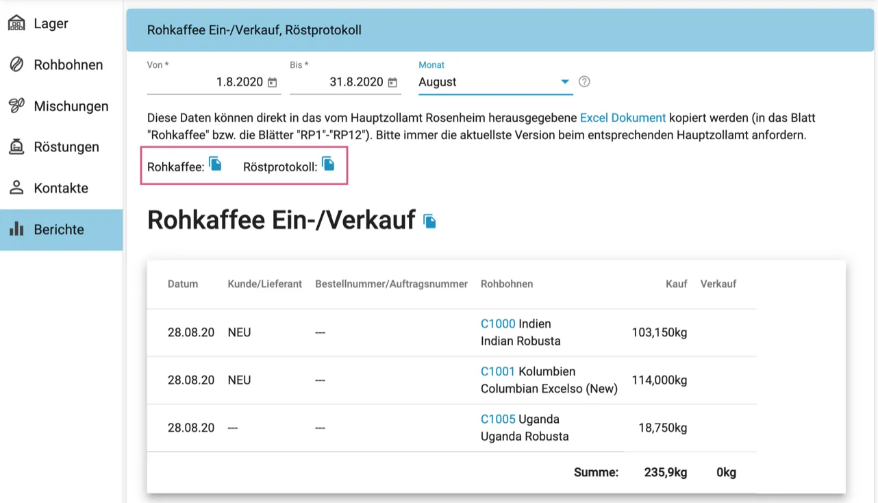 Wir konzentrieren uns auf die Monatsmeldung. Die Bestandsmeldungen funktionieren analog. Wenn man den Zeitraum, zB 8/2020, auswählt, dann bekommt man sofort die beiden Berichte angezeigt. Oben an steht der Rohkaffee Ein-/Verkauf Bericht.