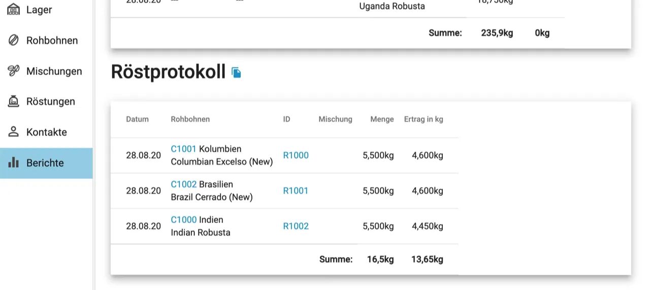 Unter dem Rohkaffee Ein-/Verkauf Bericht steht das Röstprotokoll.
