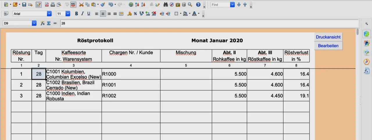Für manche Nutzer reicht diese Form von Röstberichten für die Meldungen an die Zollbehörde aus. Manche Zollämtern erwarten die Daten aber in spezifischen Formaten. Üblicherweise existiert hierzu ein spezielles Excel Dokument in das der Röstmeister die Daten über alle Röstungen und die Rohkaffeeerwerbe über das Jahr einzutragen hat.